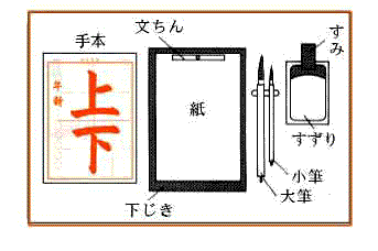 上の図が机を使用して書く際の書道用具のならべ方です。