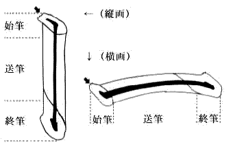 [始筆] 書き始めの部分を始筆といいます。 約45度の角度で筆を入れ、筆圧を加えます。 [送筆] 始筆から終筆までの中間の部分を送筆といいます。 そのまま体で運びます。 [終筆] 書き終わりの部分を終筆といいます。 始筆と同じ約45度の角度でしっかりと止めます。